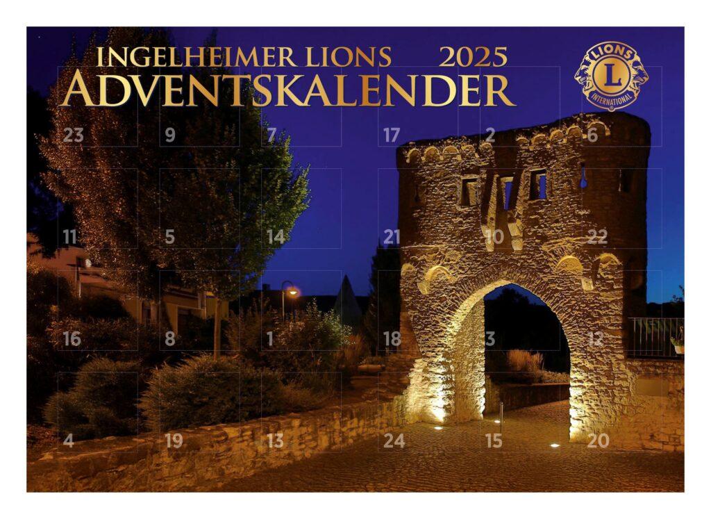 Die Bekanntmachung der Gewinnnummern erfolgt ab dem 01.12.2025 regelmäßig unter www.lionsclub-ingelheim.de/adventskalender und in der Allgemeinen Zeitung, Ausgabe Ingelheim sowie in Ingelheim: Hammers Shop, Gebrüder-Grimm-Str. 2A | Buchhandlung Wagner, Friedrich-Ebert-Str. 5, | pfalz-apotheke, Bahnhofstraße 26 | Tabak–Bambach, An der Burgkirche 2 | im Schaukasten der Praxis Hegemann/Franck, Grundstr. 31 | Heidesheim: Hammers Shop, Mainzer Str. 1 | Apotheke Steidle, Mainzer Str. 9, | Gau-Algesheim: herr holgersson, Marktplatz 4, | Metzgerei Wald, Langgasse 3